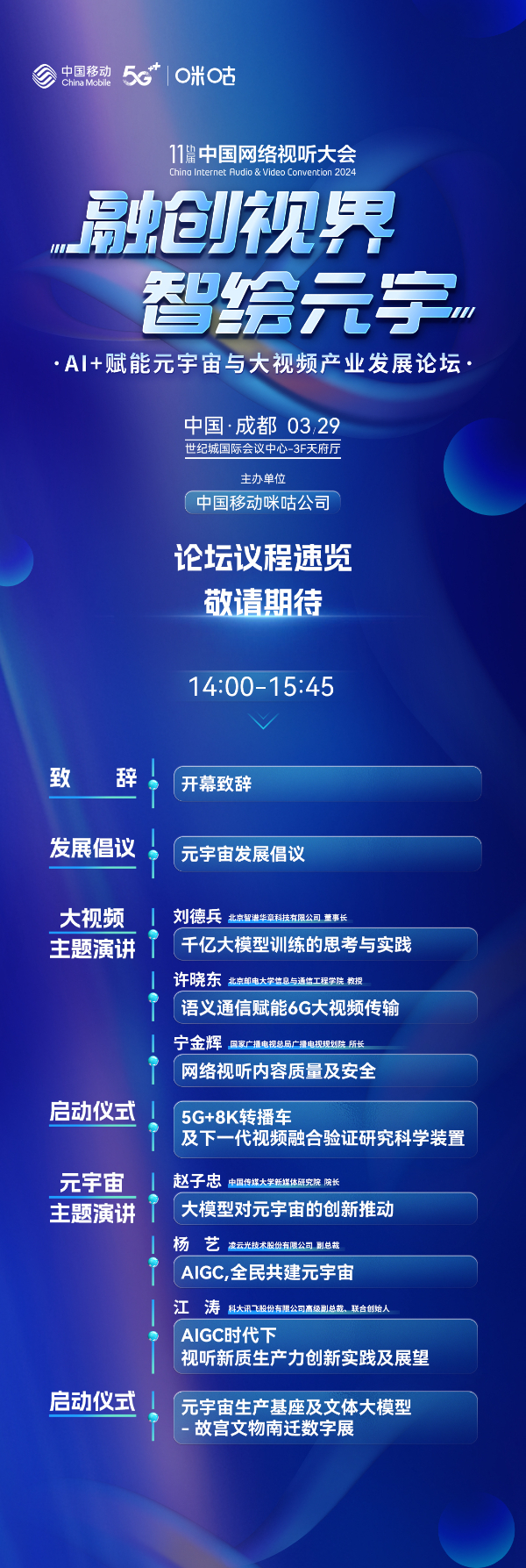 而在另一场以“融创视界 智绘元宇”为主题的AI+赋能元宇宙与大视频产业发展论坛上,响应“全面推进‘AI+’行动,加快形成新质生产力”的时代号召,咪咕将聚焦AI+元宇宙、AI+大视频领域的创新技术,邀请业界合作伙伴与科技领域学者、专家一起,见证全球首辆符合具备国际最高标准的5G+8K转播车落地和下一代视频融合验证研究科学装置启动; 感受AI+元宇宙文博标杆性案例“故宫文物南迁纪念展”的数实融合魅力,在元宇宙生产基座及文体大模型的加持中,展望科技赋能文化创新传承的更多可能;跟随诸多行业视角,在嘉宾们的独家见解中全方位感受AI+在元宇宙和大视频产业的落地与应用。