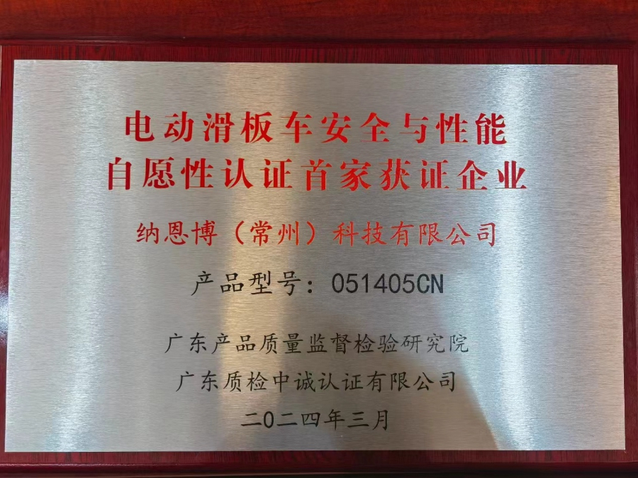 九号公司旗下负责电动滑板车研发生产的纳恩博(常州)科技有限公司获“电动滑板车安全与性能自愿性认证首家获证企业”