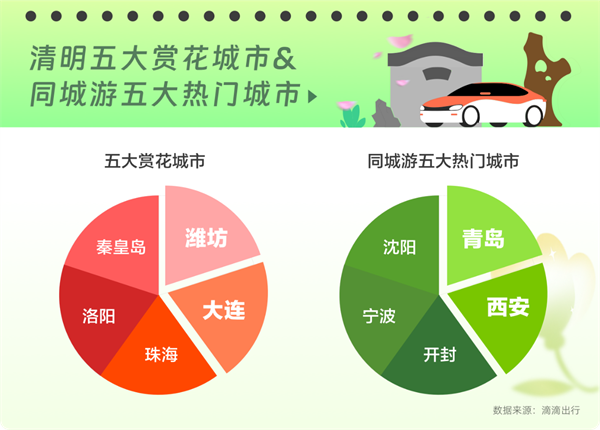 在这个草木萌动、百花盛开的日子里,秦皇岛、潍坊、洛阳、珠海、大连成为今年清明五大赏花城市,前往公园植物园的打车需求同比去年上涨均超过200%,其中秦皇岛同比上涨548%。