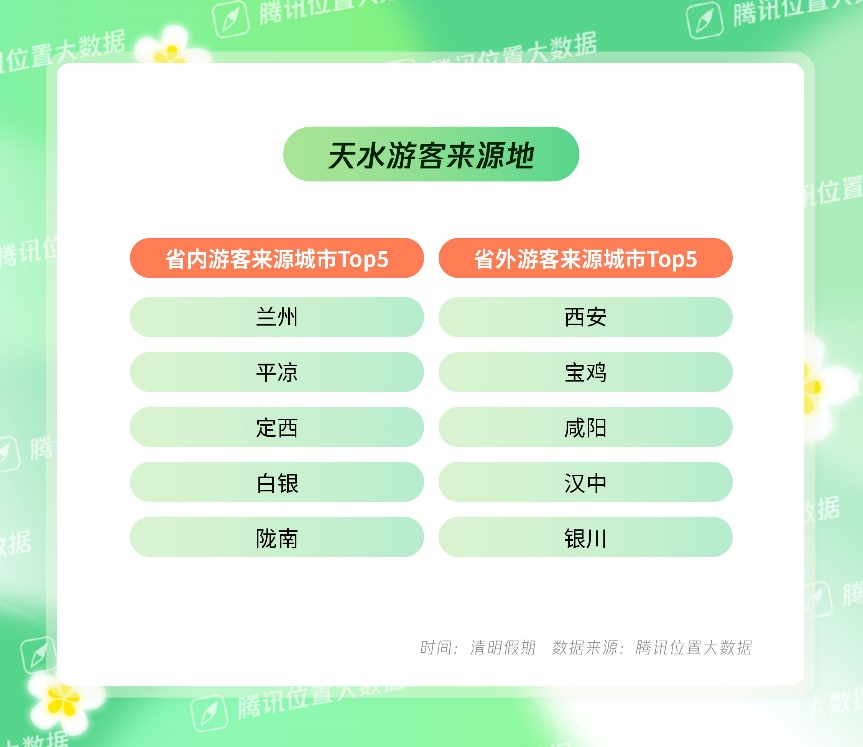 从客源地来看,腾讯位置大数据显示,打卡天水热门景区最多的游客基本以本省游客和陕西、宁夏、青海等西北游客为主。本省游客中,除去天水本地人外,来自兰州、平凉、定西的人最多,而在外省游客中,西安、宝鸡、咸阳、汉中、银川、西宁的游客构成了主力打卡人群。