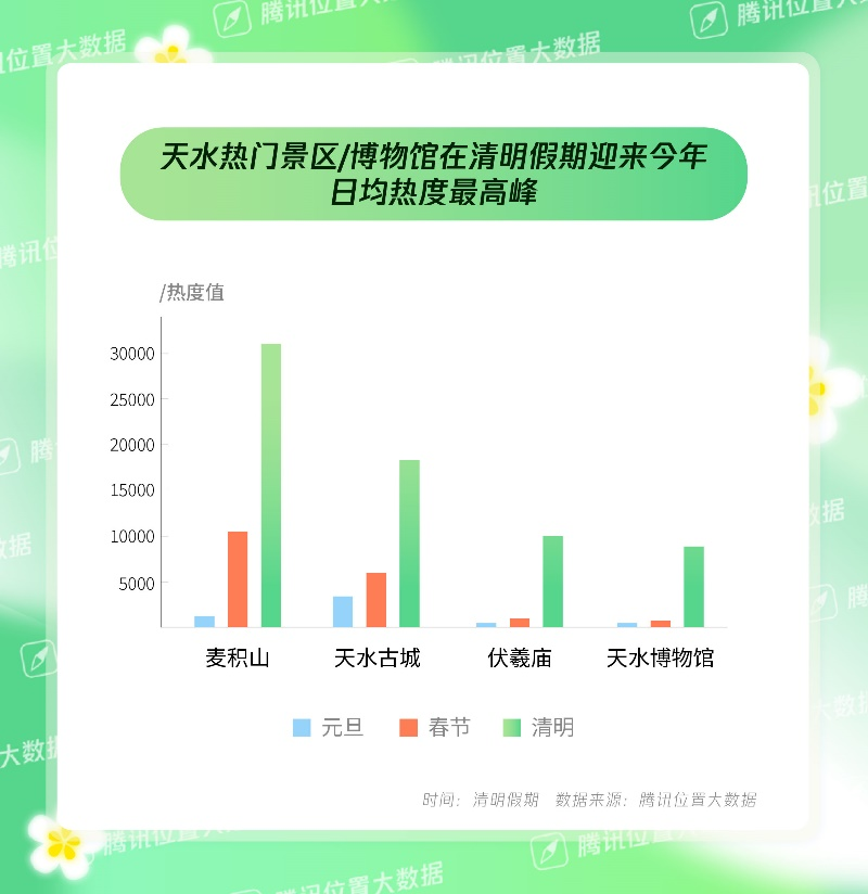 与麻辣烫一条街一样,腾讯位置大数据显示,麦积山风景名胜区、天水古城、伏羲庙、天水市博物馆等热门景区和博物馆,均在清明假期达到了迄今为止的年度峰值。其中,麦积山风景名胜区作为天水唯一的国家AAAAA级景区,清明假期的日均热度较春节假期增长了约200%,天水市博物馆作为天水唯一的国家一级博物馆,这一数据更是超过了600%。