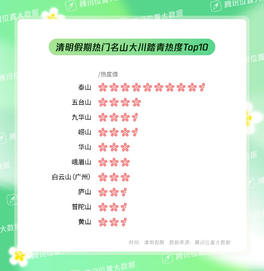 清明踏青是传统习俗。腾讯位置大数据显示,今年清明小长假,泰山、五台山、九华山、崂山、华山成为踏青登高热度最高的名山大川。