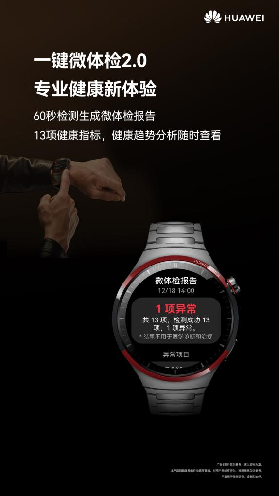 而此次华为太空表率先升级一键微体检2.0。首先,全面除了支持60秒检测10 项基础健康数据之外,微体检报告上还新增脉搏波心律失常分析、睡眠呼吸暂停筛查、最近一次的高血糖风险评估*等检测分析结果,共计13项健康数据,更全面地了解健康状况;其次,智能化升级,与上一次微体检报告数据进行智能对比,了解健康变化趋势;最后,互联性更强,微体检报告支持收录由华为体脂秤3 Pro、三方血压计等生态互联设备提供的检测数据。