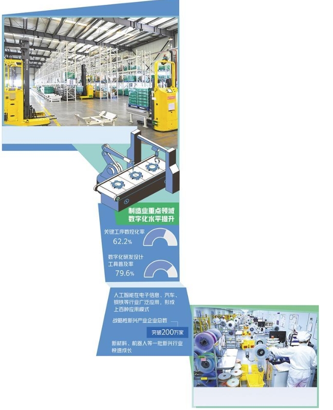 从产业层面看,传统产业稳步转型。新质生产力成为打造经济高质量发展的重要载体。制造业重点领域数字化水平提升,关键工序数控化率、数字化研发设计工具普及率分别达到62.2%和79.6%。人工智能在电子信息、汽车、钢铁等行业的研发、生产、管理等全环节实现广泛应用,形成上百种应用模式,有效提高了生产效率。战略性新兴产业企业总数突破200万家,新材料、机器人等一批新兴行业快速成长,“新三样”产品增势迅猛。人形机器人、量子计算机、新型显示、脑机接口、6G网络设备、超大规模新型智算中心、第三代互联网等未来产业标志性产品加速打造。