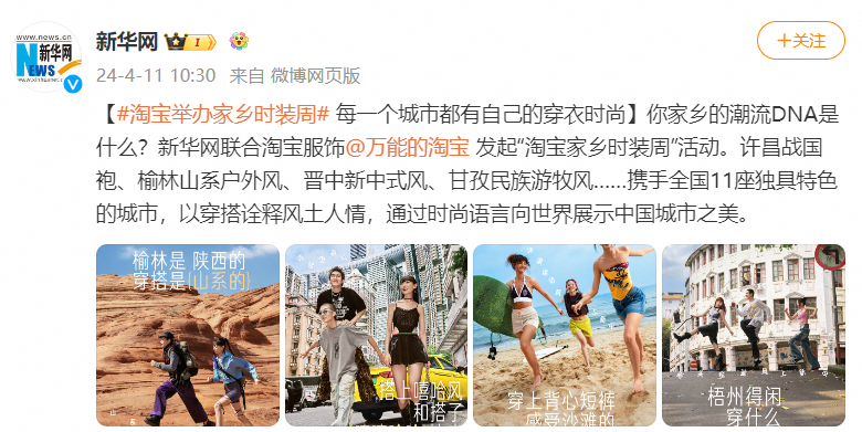 时尚秀场不止在北上广,也可以在家乡的雪山边、城墙旁、古城里。4月11日,淘宝联合新华网发起“家乡时装周”活动,以许昌、天水、漳州、康定等11个独具特色的城市为支点,用服饰穿搭展现当地风土人情,鼓励大家穿出家乡的时尚风格。