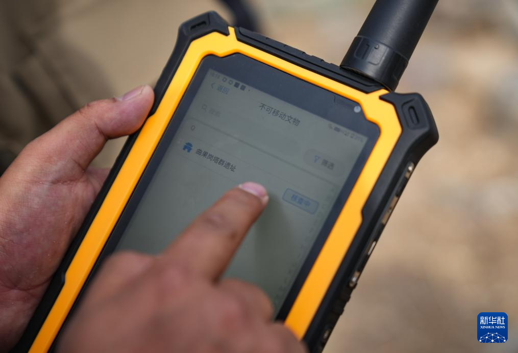 4月11日,普查人员手持移动端数据采集设备在曲果岗塔群遗址现场开展数据采集。新华社记者 晋美多吉 摄
