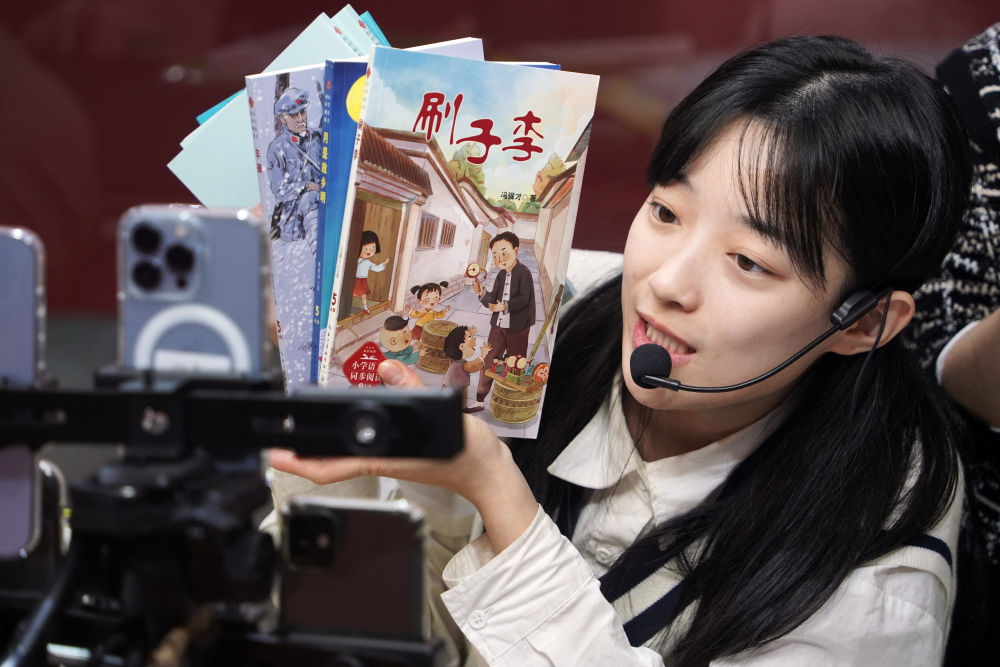 1月11日,2024北京图书订货会上,一名主播在直播推介图书。新华社记者 潘旭 摄