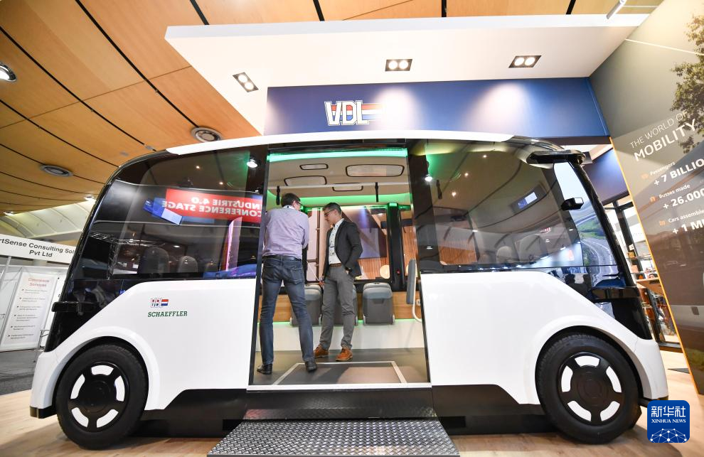 4月23日,人们在德国汉诺威工博会上参观一款无人驾驶汽车。