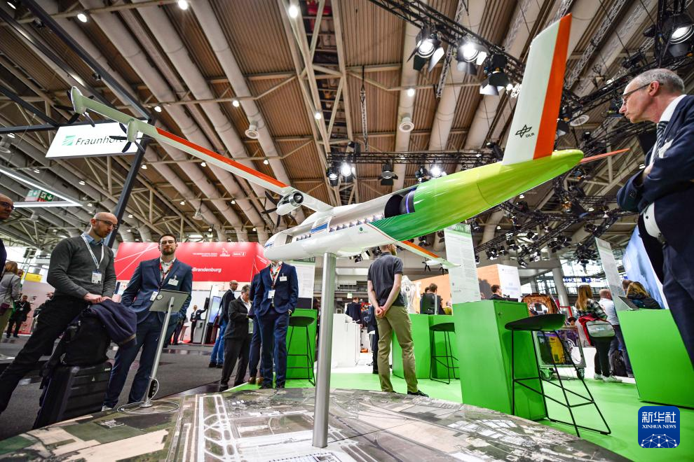 4月22日,人们在德国汉诺威工博会上参观一款氢能飞机模型。