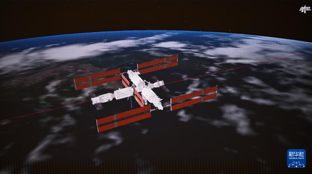 这是4月26日在北京航天飞行控制中心拍摄的成功对接后的神舟十八号载人飞船和空间站组合体的模拟画面。新华社记者 金良快 摄