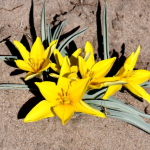 据周繇介绍,蒙古郁金香是多年生草本植物,植株高10至25厘米,花为鲜黄色,花期5月份,果期6月份,生于草原带覆沙地中,仅分布于我国内蒙古,是当地特有种,也是郁金香属植物在全球分布最东的一个物种。