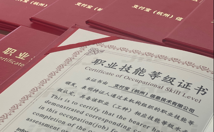 支付宝多年前就基于自身技术实践经验,推出数字技能认证服务,并提炼出一套可学、可练、可考的技能认证体系与标准。学员只要通过考试认证,就会获得一张由支付宝技能认证颁发的证书。