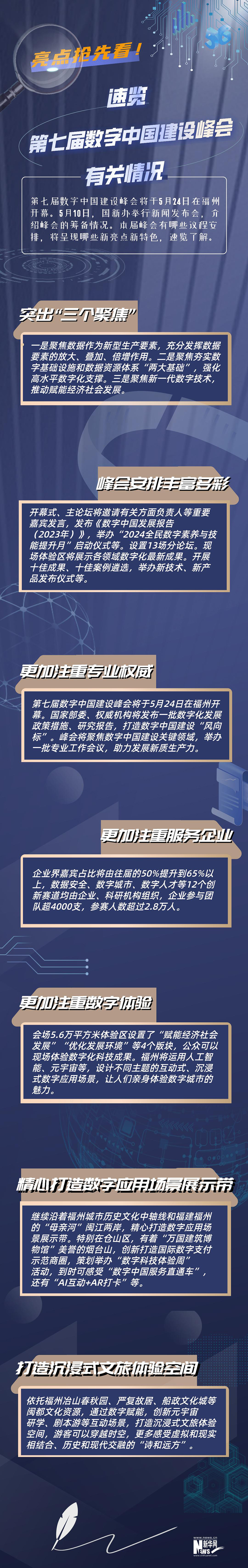 第七届数字中国建设峰会将于5月24日在福州开幕。5月10日,国新办举行新闻发布会,介绍峰会的筹备情况。本届峰会有哪些议程安排,将呈现哪些新亮点新特色,速览了解。