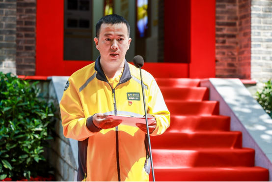 美团外卖骑手代表王兵臣在共建活动现场发言