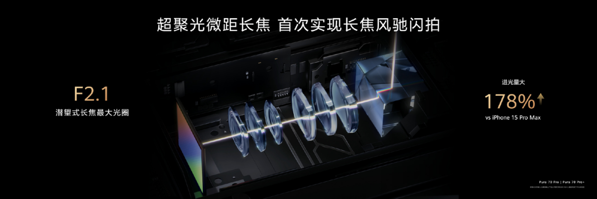 HUAWEI Pura 70 Pro、HUAWEI Pura 70 Pro+、HUAWEI Pura 70 Ultra搭载的超聚光微距长焦摄像头具有潜望式长焦F2.1光圈,支持超高速风驰闪拍。远处的赛艇、过山车都不在话下。