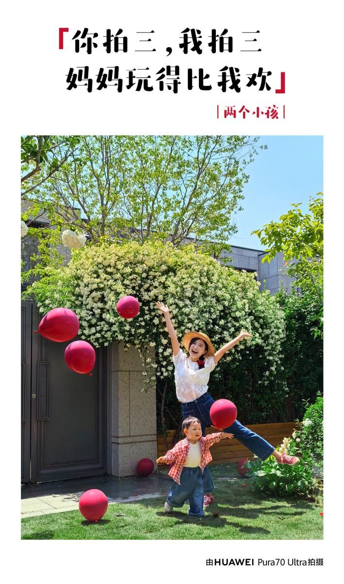 这幅样张中,一位年轻母亲和与孩子正在欢快玩耍,在红色气球和绿色庭院相衬下,华为Pura 70 Ultra搭载的XMAGE色彩风格,展现了这一场景丰富的色彩对比和层次感,营造出充满生气的童趣氛围,让画面中的母亲仿佛回到了童年时在院子里嬉戏的美好时光。