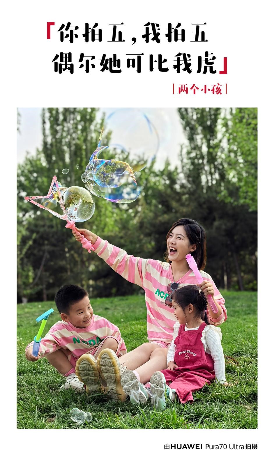 在下面这幅照片中,华为Pura 70 Ultra精准捕捉到母子三人生动的神情与动作,镜头下的人物五官和草地细节,均表现得丝丝入扣。此外,透明泡泡特有的缤纷色彩还原真实,种种细节足以媲美专业设备的成像效果。