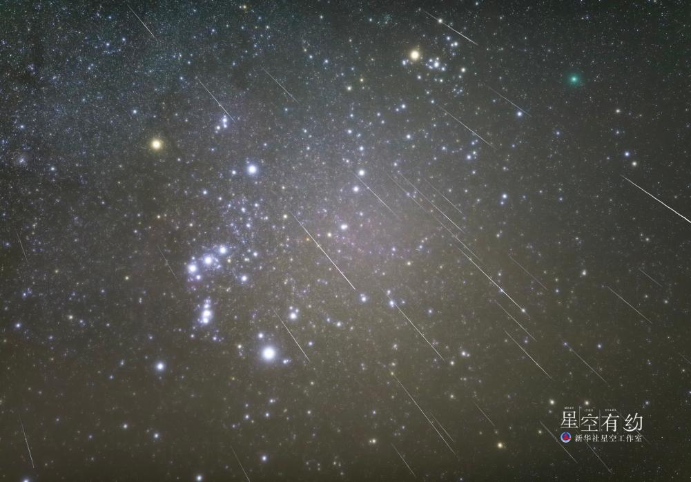 这是2018年12月14日在内蒙古多伦县拍摄到的双子座流星和46P彗星(右上角绿色小圆团)。(北京星空摄影爱好者周博 摄)