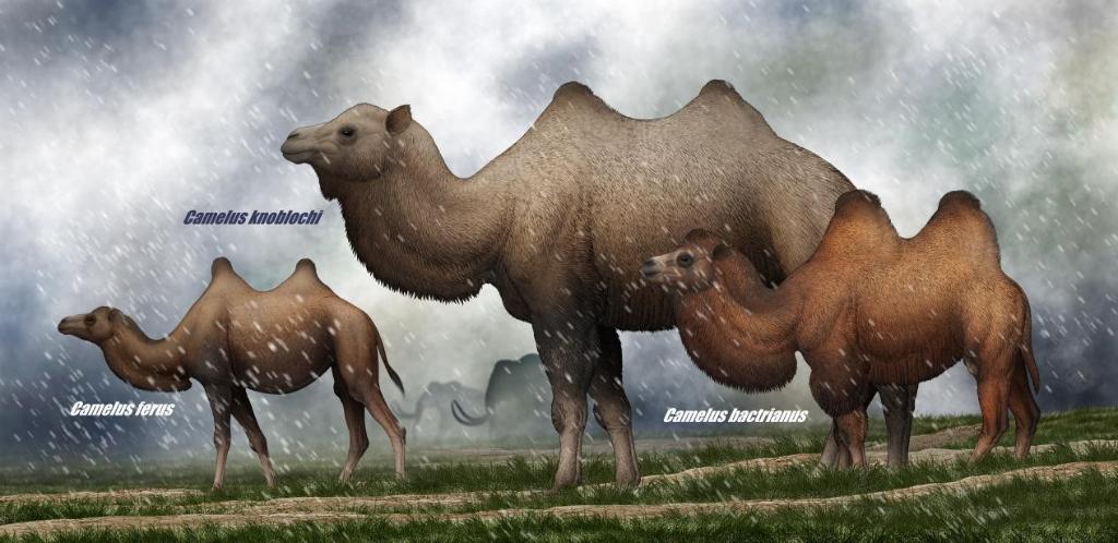 已灭绝的诺氏驼复原图(中)与现生的野双峰驼(左)和家双峰驼(右)。(中国国家博物馆环境考古研究所供图)