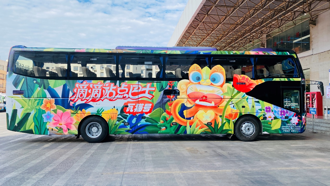 6月6日开始,一辆辆非常有大理当地特色的“瓦猫号”彩蛋大巴车出现在大理往返丽江的线路上。不仅大巴车身换上“瓦猫结合鲜花”外衣,车内地毯、天窗等装饰也焕然一新,车上还有瓦猫口吻的趣味车载广播,司机师傅统一穿着瓦猫+鲜花元素的花衬衣,主动欢迎乘客并帮拿行李。这些趣味感十足又贴心的彩蛋大巴车是由滴滴出行携手云南交运、大理交运、丽江交运联合打造。