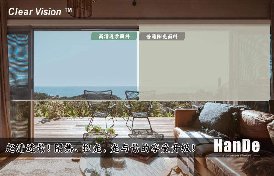 卷帘阳光面料分为透光和不透光两类。对于透光面料,多数企业难以实现透景清晰、高隔热、控眩光三种功能的完美融合。为此,汉德不惜投入大胆尝试,从纱线原料进行改造,历经一年多的反复调试,终于成功织造出兼具高清透景效果、高隔热和控眩光功能的面料,并获得国家发明专利。