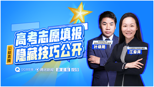 近日,QQ浏览器联合腾讯新闻、新京报共同发起“高考志愿填报隐藏技巧公开”公益直播,中国教育在线副总编辑江爱萍、华东师范大学教育经济实验室访问教授叶晓阳在线为考生讲解志愿填报“干货”,指导考生如何用科学的方法和公益普惠的工具,学会自己靠谱填志愿。