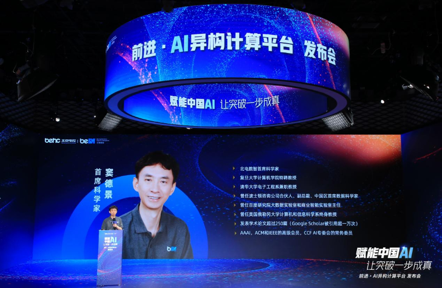 北京电子数智科技有限责任公司首席科学家窦德景教授对前进·AI异构计算平台进行了介绍。
