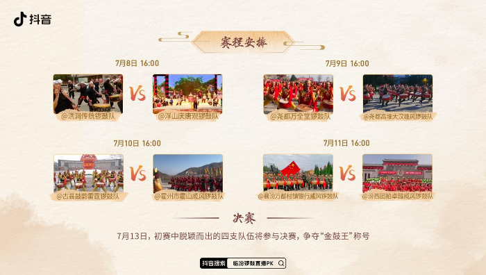 比赛全程将在抖音进行直播。用户打开抖音搜索“临汾锣鼓直播PK”,即可了解活动信息、预约观看直播,为支持的队伍加油。