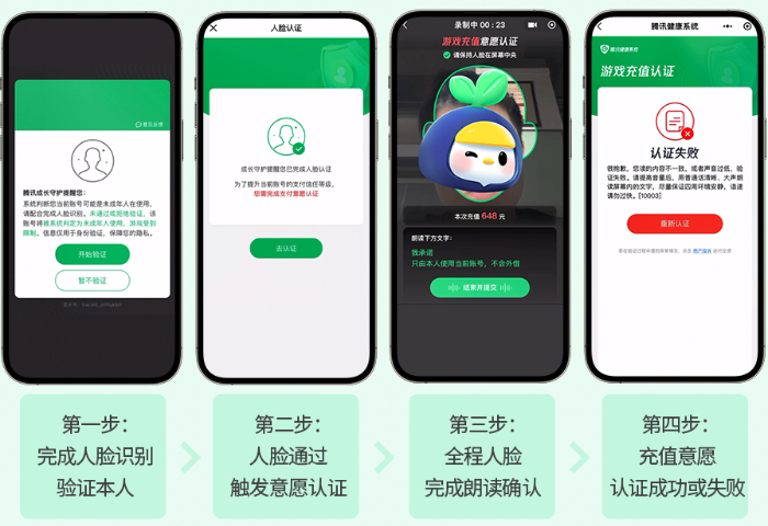 第二,首推“防代过人脸巡查” ,为防止家长等成年人代过人脸,在触发人脸过程里加强“充值提醒”并新增“充值意愿认证”功能。当疑似未成年人账号触发人脸识别后,系统将直接提醒该账号正在进行充值行为和具体金额,避免家长在不知情的情况下帮孩子代过人脸进行充值。针对部分高度疑似账号新增“充值意愿认证”流程,这类账号触发人脸识别后,除文字提醒游戏充值金额、语音强调游戏充值行为外,还需要用户朗读确认本人充值意愿。