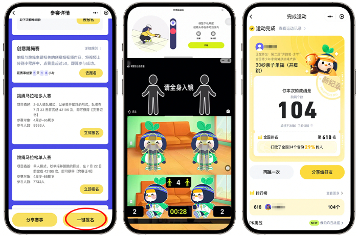 目前,由国家体育总局青少司指导,全国青少年体育联合会和腾讯成长守护主办的第二届“奔跑吧·少年”全国青少年家庭健康跳绳大赛正在进行中。家长和孩子可以共同参与“30秒亲子单摇”“跳绳马拉松”等赛项。