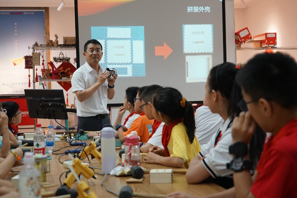 7月15日,小朋友们在“21世纪车间”组装“全息投影仪”。新华社记者林光耀 摄