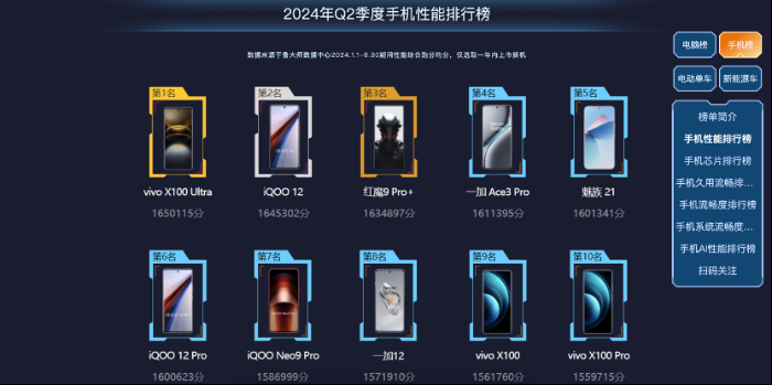 2024年Q2的手机性能榜,依旧是骁龙8 Gen3和天玑9300终端的天下,但是和Q1相比,性能旗舰和电竞手机的迎来了新对手,影像旗舰反而在性能表现上更胜一筹,榜首的vivo X100 Ultra就是如此。