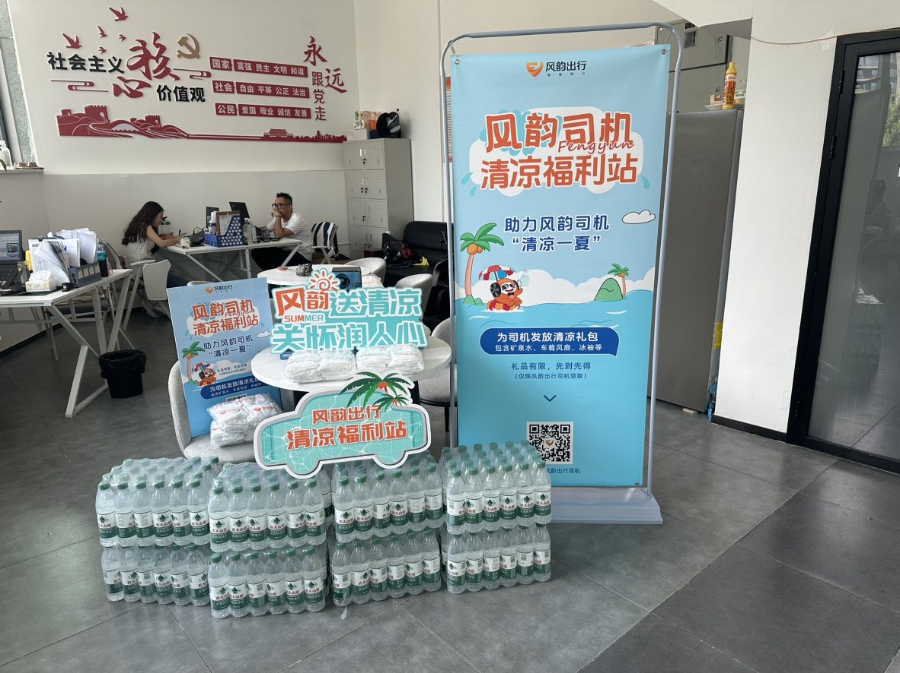 成长于湖北武汉的网约车平台风韵出行,在南昌、青岛、广州、宁波等城市的司机服务中心也专门打造了一个个“清凉福利站”,为司机准备了饮用水、车载风扇、冰袖等防暑物资。