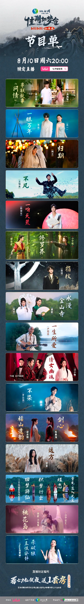 根据晚会公布的节目单,晚会上演员罗云熙将演唱热门影视歌曲《不染》,带观众重温经典角色翩翩公子“小鱼仙倌”润玉。歌手卢冠廷再演经典“爱情圣歌”《一生所爱》,展现至尊宝与紫霞仙子的经典爱情故事。歌手黄龄与阿兰将化身经典民间故事《白蛇传》中的“青白CP”白素贞、小青,献唱《水漫金山寺》。歌手汪小敏搭档独立电子乐团THEEITHER演绎经典之作《倩女幽魂》,重现“人鬼情未了”的中式浪漫。