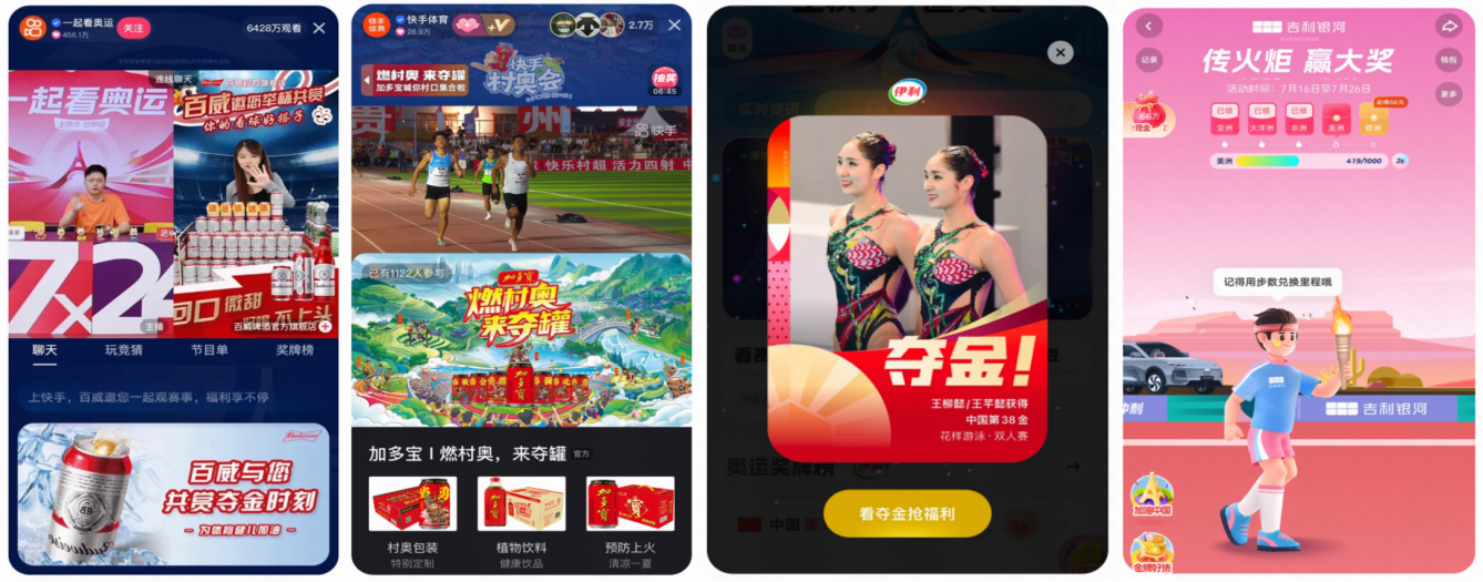 商业化方面,快手已成为越来越多品牌在体育营销上的首选平台,此次包括150多个品牌与快手联合共探营销创新。其中,围绕“快手村奥会”场景,加多宝、贪玩、滴滴在开幕式及赛事现场,通过花式品牌植入传递品牌价值;在线上通过直播+转化组件,与用户深度互动,实现品效销一体化。同时,结合高流量的夺金内容,快手在奥运主会场及以外覆盖多个主要流量场景,以“夺金时刻”弹窗形式,为伊利带来超强曝光,提升品牌美誉度。此外,快手携手吉利在火炬会场和互动游戏场景创新体育营销玩法,汽车以及定制卡通形象全程陪同用户“跑”向巴黎,建立产品形象和产品心智。