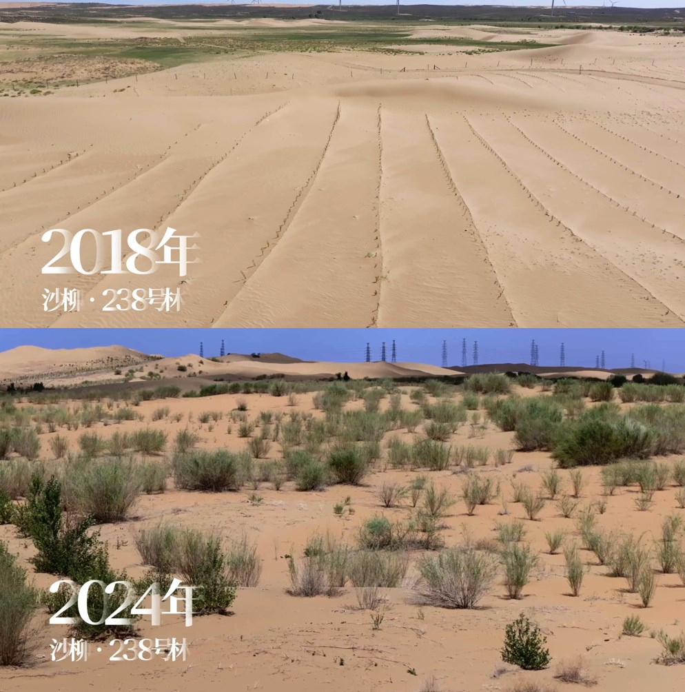 “我从2018年开始种植花棒,眼见着自治区阿拉善盟沙丘不仅变小了,而且移动速度也明显变慢,一到夏天你走上沙丘看看,一片绿色,心情特别好”,内蒙古阿拉善左旗乌尼格图嘎查的种树人雷新光说,种植花棒之前沙丘一年东移七八米,如今明显减缓到每年2米左右。