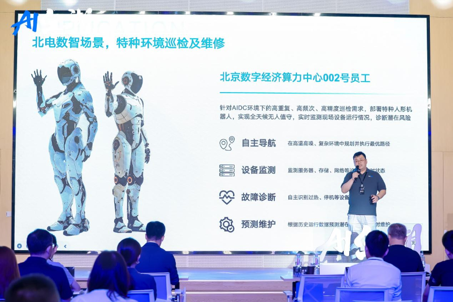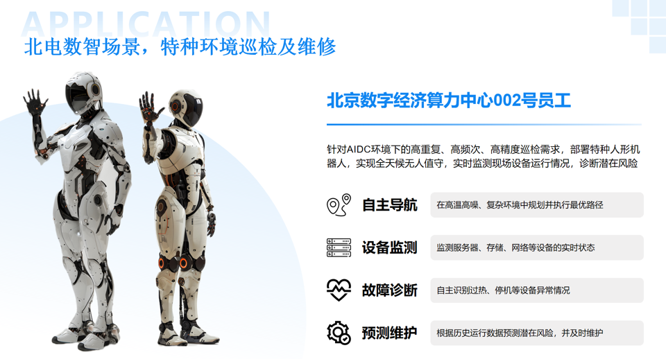 目前,北电数智在特种服务领域,正在推进特殊环境巡检场景的落地。在北京数字经济算力中心(AIDC)部署特种人形机器人“002号”,它能够针对AIDC环境下的高重复、高频次、高精度巡检需求,实现全天候无人值守,实时监测现场设备运行情况,诊断潜在风险。未来还有更多的场景开放,将与所有合作伙伴共同开发。
