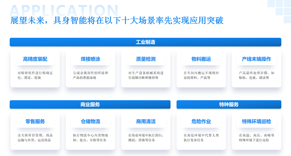 随着技术的进步和数据管理能力的提升,具身智能有望在更多领域展现其独特价值。北电数智基于其在具身智能行业的认知及技术积累,从任务复杂程度、任务通用化程度和市场占有率三个主要维度,提炼出具身智能更具发展前景的十大场景,分别分布在工业制造、商业服务和特种服务三大领域。
