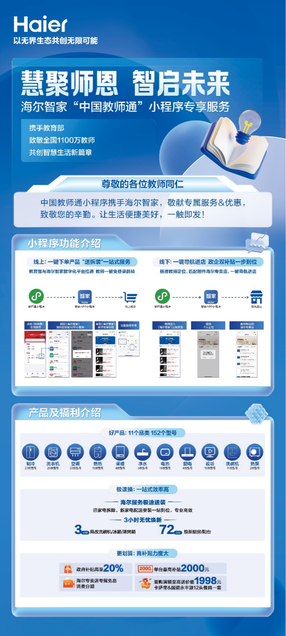 海尔智家积极响应教育部号召、率先投身实践,为全国1100万教师带来4大专属权益。