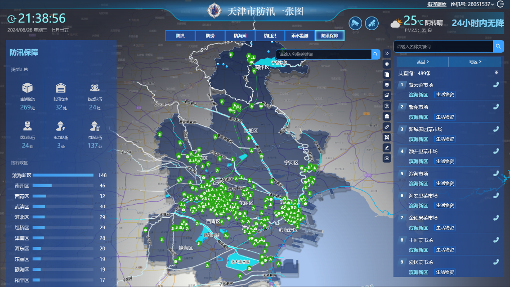 据天津市应急管理局网信办主任王旭介绍,围绕当地“上防洪水、中防沥涝、下防海潮、北防山洪”的防汛格局,天津市应急管理局设计开发出“防汛一张图”信息化系统,为汛期监测预警、指挥决策提供有力支撑。“应急措施、机械装备等资源信息标绘在统一地理信息平台上,各类交通路网、水库塘坝、燃气电力、通信设施也一目了然。”王旭说。