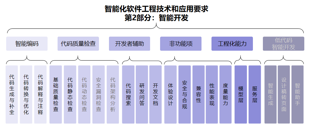 据悉,中国信通院于2024年4月与四十余家头部企业共同编制发布了《智能化软件工程技术和应用要求 第2部分:智能开发能力》标准。本次评估以此标准为依据,涉及5个能力项,14个能力子项,191个能力要求,评估内容涵盖智能编码、代码质量检查、开发者辅助、非功能项和工程化能力,考察方向十分深入、全面。