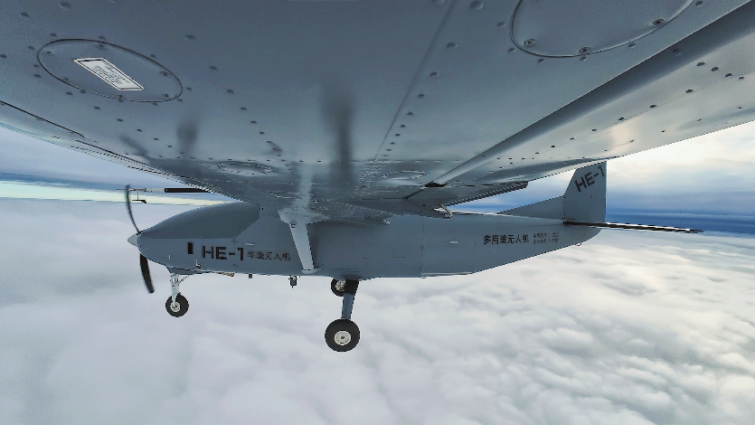 华鹰HE-1系列定位于多功能大型运输-平台类无人机,该机型是集运输、应急救援、通信中继等功能于一体,广泛应用于军民多种应用场景。在具备空投装置,实现低空精准物资投放的同时,还具备灵活配置能力,机翼下左右装置各一个多功能挂点,根据任务需求快速转换任务挂载,有效提高特种及应急场景的任务效率。该机型具备复杂电磁环境下的起降、自主飞行能力;具备短距离铺装/砂石/草地起降能力;具备高原、海岛无限制运行,昼夜全天候运行能力;具有良好的安全性、可靠性、经济性、保障性和环境适应性。该机型最大起飞重量4吨,有效载重2吨,翼展16.8米,机长14.2米,采用单发螺旋桨发动机,功率大于800kw,实现飞机与动力匹配设计与试验,确保飞机飞行性能与装载能力。