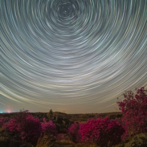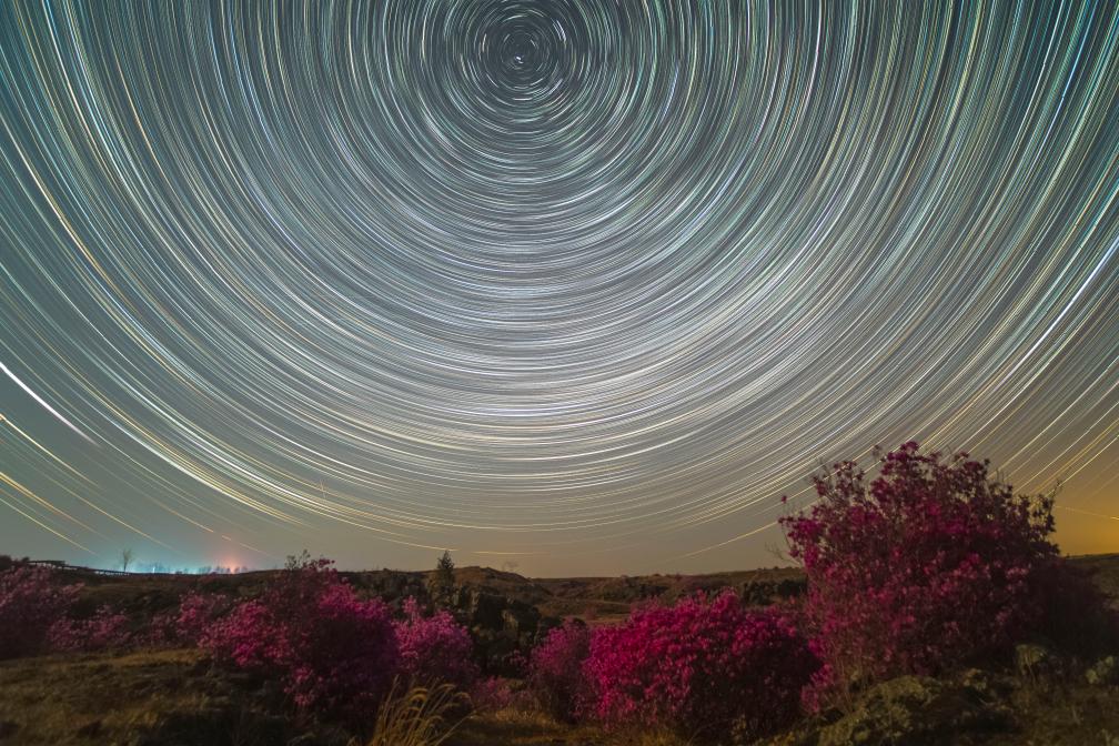 在黑龙江省牡丹江市宁安市拍摄的杜鹃花和星轨(5月1日摄,堆栈合成照片)。新华社发(王宝勋摄)