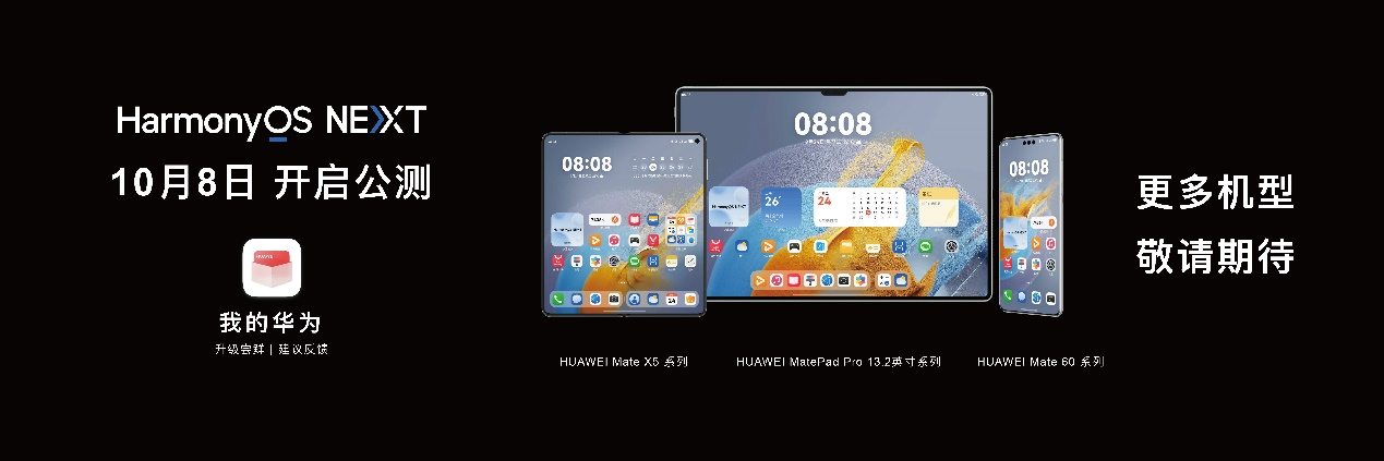 会上,华为常务董事、终端BG董事长、智能汽车解决方案BU董事长余承东宣布, HarmonyOS NEXT将于10月8日正式开启公测,首批公测机型包括华为Mate 60系列、华为Mate X5系列和华为MatePad Pro 13.2系列。消费者可以通过“我的华为”APP-“升级尝鲜”申请升级。