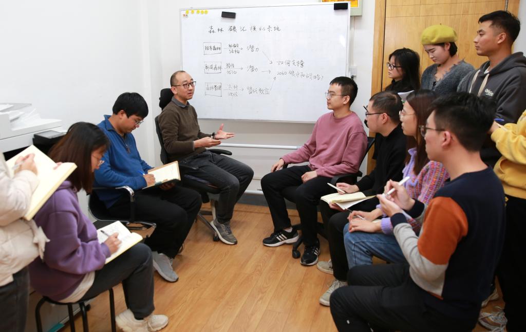 西北农林科技大学青年科学家岳超(左三)和团队讨论科研方案(资料图片)。新华社发