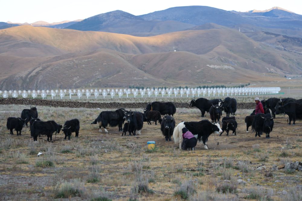 这是9月18日拍摄的“千眼天珠”抛物面天线和牧牛景象。新华社记者 金立旺 摄