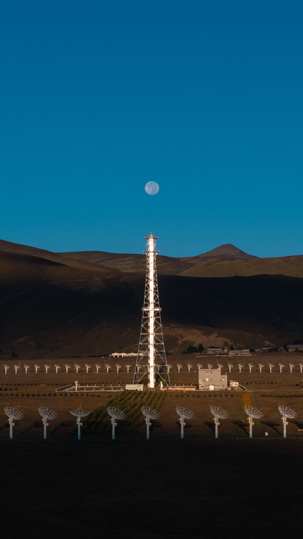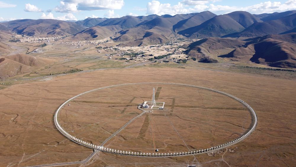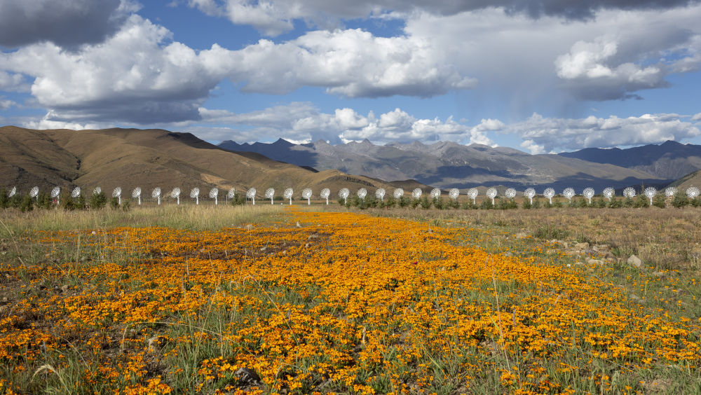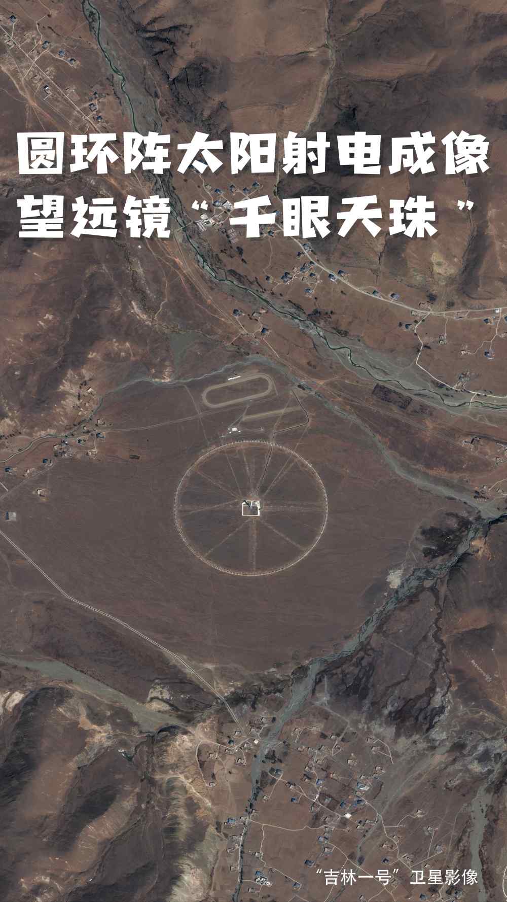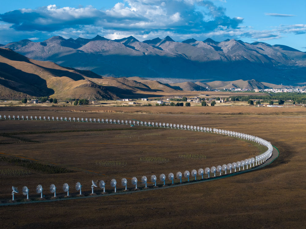 圆环阵太阳射电成像望远镜位于四川省稻城县,海拔3820米,四面环山,中间平整。313部直径6米的抛物面天线围绕中间100米高的定标塔均匀排布,形成一个直径1公里的大圆环,远远望去宛如平放在高原上的一串珍珠,被当地居民形象地称为“千眼天珠”。