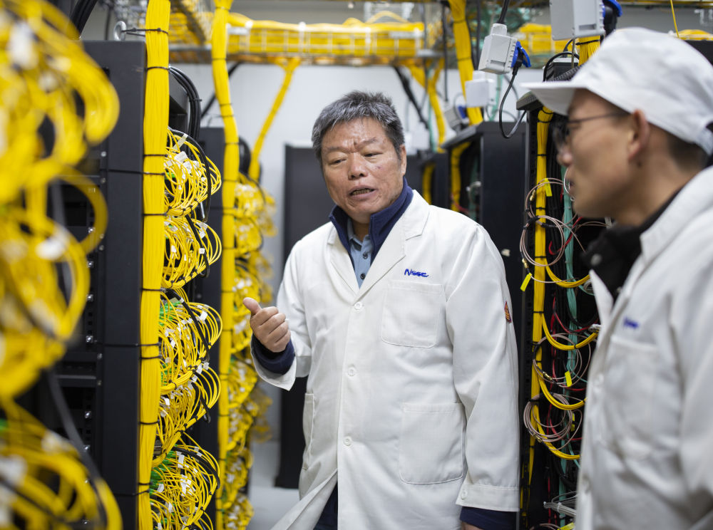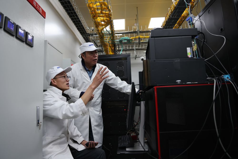9月19日,在“千眼天珠”综合楼机房,首席科学家阎敬业研究员(左)和工作人员一起讨论工作。新华社记者 高巍 摄