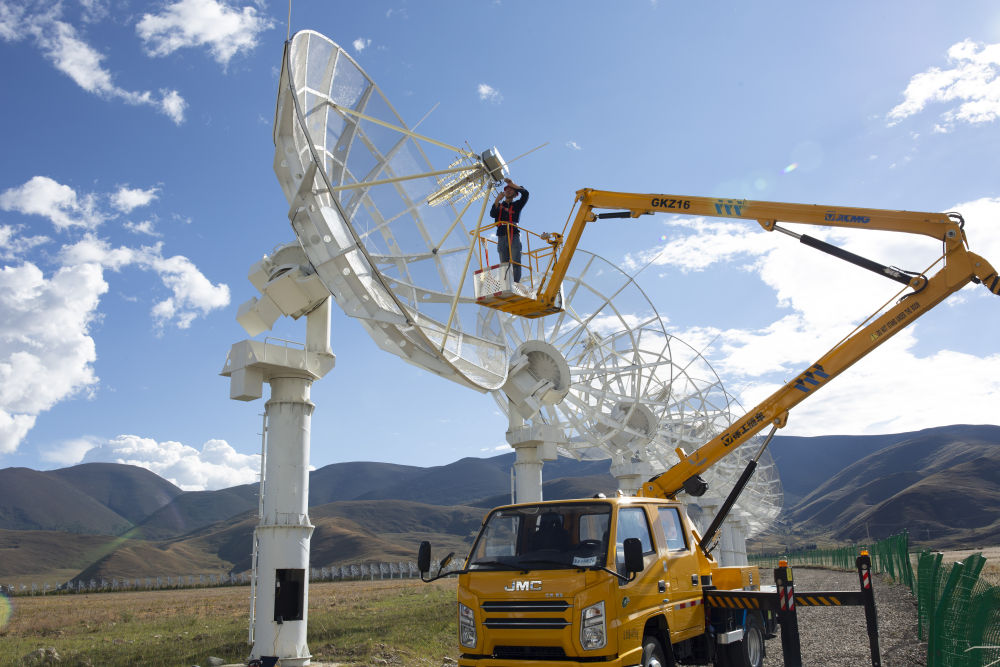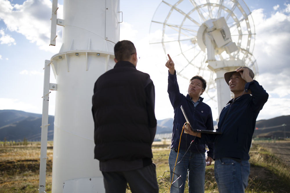 9月18日,“千眼天珠”首席科学家阎敬业研究员(中)和工作人员一起检修抛物面天线。新华社记者 高巍 摄