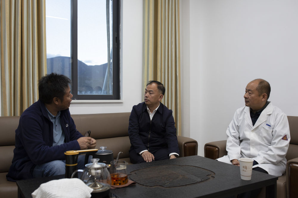 9月19日,在“千眼天珠”综合楼接待室,首席科学家阎敬业研究员(左)、站长郑朝晖和稻城县领导讨论圆环阵太阳射电成像望远镜电磁环境保护问题。新华社记者 高巍 摄